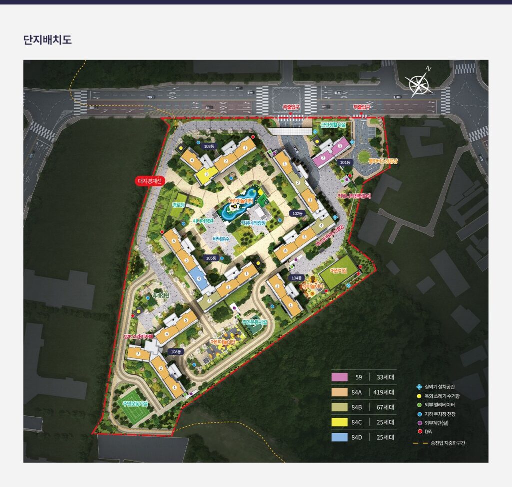 ※건물의 색채, 외관, 조경, 식재 및 보행로는 입주자의 이해를 돕기 위한 것으로 실제와 다소 차이가 있으며, 추후 인허가 과정 및 실제 시공 시 변경될 수 있습니다. 또한 구획선과 시설물의 위치 및 규모 역시 측량 결과 및 각종 평가에 따라 시공 시 변경될 수 있습니다.